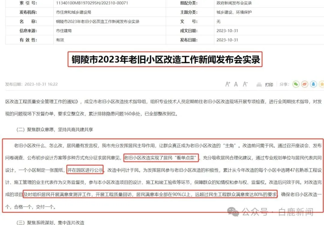 但白鹿新聞查詢銅陵市政府網站的相關報道發現,銅陵市住建局曾多次在新聞發布會上公開表示全市老舊小區改造項目事先都經過了民意調查,且群眾的民意滿意度達90%以上。