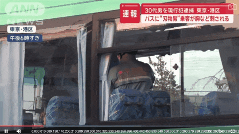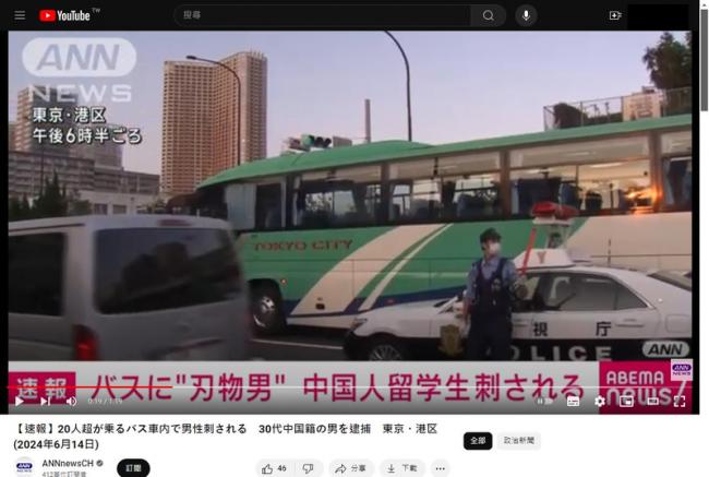 日本东京14日下午发生一名男子突然在巴士上挥刀,并且刺伤了一名男性乘客。日媒指出,凶嫌跟受害人据称都是中国留学生。(照片翻摄:YouTube / ANNnewsCH)