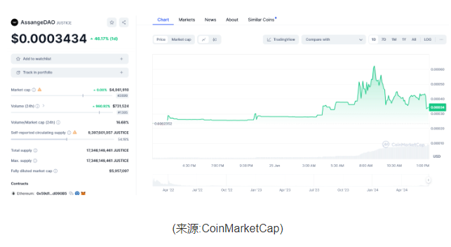 澳大利亞公民、維基解密(WikiLeaks)創始人阿桑奇(Julian Assange)傳出已與美國司法部達成認罪協議,公司在2010年釋出50萬份包括軍事紀錄、外交電報的機密檔案,阿桑奇被指控違反17項間諜法。周贰(6月25日),AssangeDAO治理代幣JUSTICE單日暴漲超過100%。