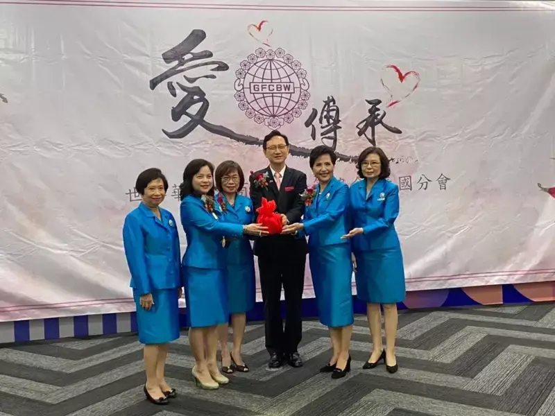 2020年,時任台“駐泰代表”童振源(右叁)與遭台灣通緝的吸金詐騙案罪犯李陳妙音(右贰)同台,毫不避嫌,圖源:台媒