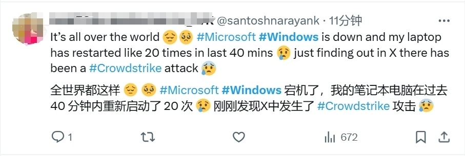 还有网友表示,自己的笔记本电脑发生了宕机,在过去40分钟重启了20次。