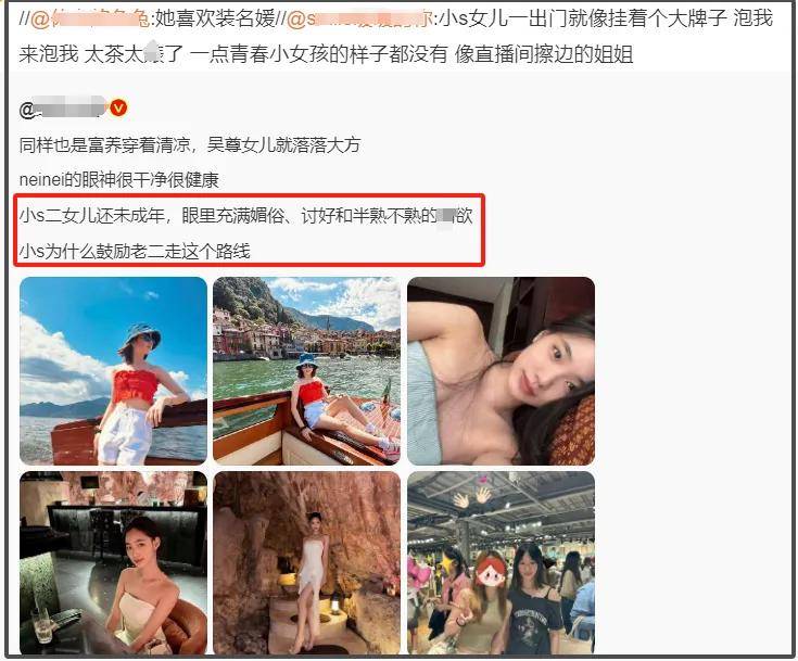 其实早就有网友提到过,同样是不缺钱的星二代,绝大部分未成年小女孩就算穿着成熟,也很少给人擦边感,偏偏小S的女儿们,特别是二女儿,总是引发擦边争议,从网友们的态度看,大家并没有攻击未成年人的意思,基本上都认为问题出在家长身上。