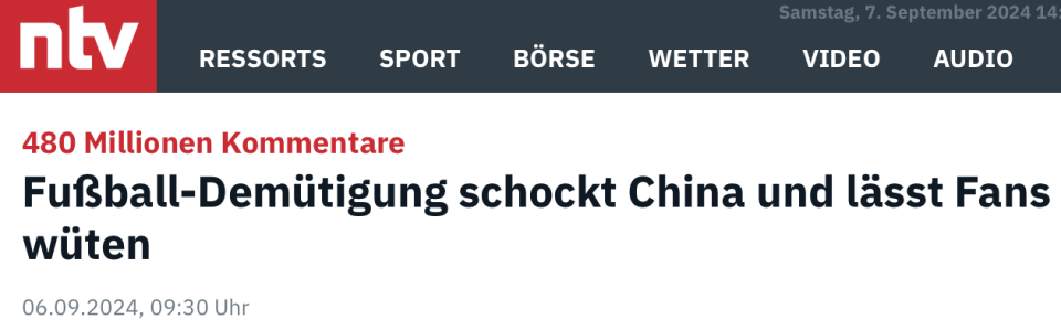 “在2026年世界杯预选赛上,中国男足0-7惨败日本遭受惨痛耻辱!”德国新闻电视台6日称,球队遭受了“灾难性的失败”,中国足球跌入了“谷底”。中国队希望2026年能第二次参加世界杯的前景很糟糕。《法兰克福评论报》则感叹,拿了40块奥运金牌的中国体育成功机制,却无法复制在足球上。