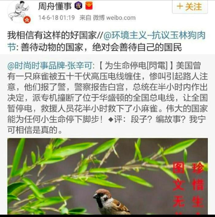 還有經典的《美國剪斷高壓電線救麻雀》:美國曾經有壹只麻雀被伍拾千伏高壓電線纏住,慘叫引起路人注意,他們報了警,警察報告白宮,總統在半小時內作出決定,派專機撞斷了位於華盛頓的全國總電線,讓全國暫停電,救援人員花半小時救下了小麻雀。偉大的國家能為任何小生命停下腳步。