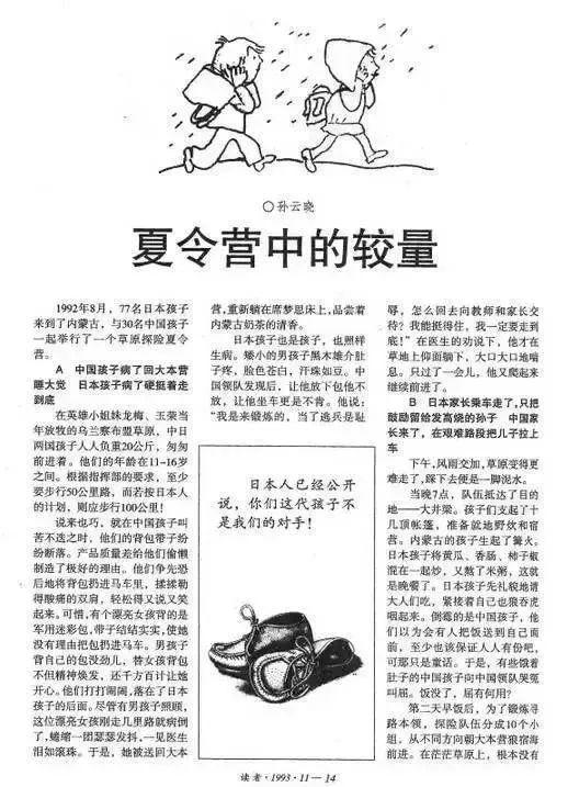 早在1994年3月5日,也就是《夏令營的較量》刊載在《讀zhe》雜志1993年11月刊、引發社會轟動不到半年時,《北京青年報》的副總編就曾在其報紙的周末版頭條上,刊登了壹期名為《杜撰的較量——所謂日本孩子打敗中國孩子的神話》的文章。