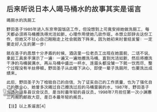 這個故事的主角,在各種版本中輪著換過好幾個,但是最出名的還是野田聖子,曾任日本總務相,她作為職場新人洗廁所的勵志故事,樹立起了人們對於日本工匠精神的仰望——
