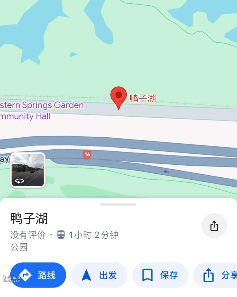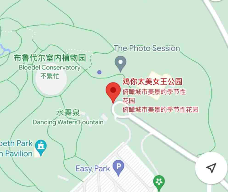 本以为事情就这样结束了,但是在谷歌地图上顺着这个餐厅再往外“走几步”,就会发现旁边的公园,也有了让人费解的中文名。在“巴嘎king”餐厅的旁边,Sunnynook Park的中文名字变成了“鸡你太美公园”。