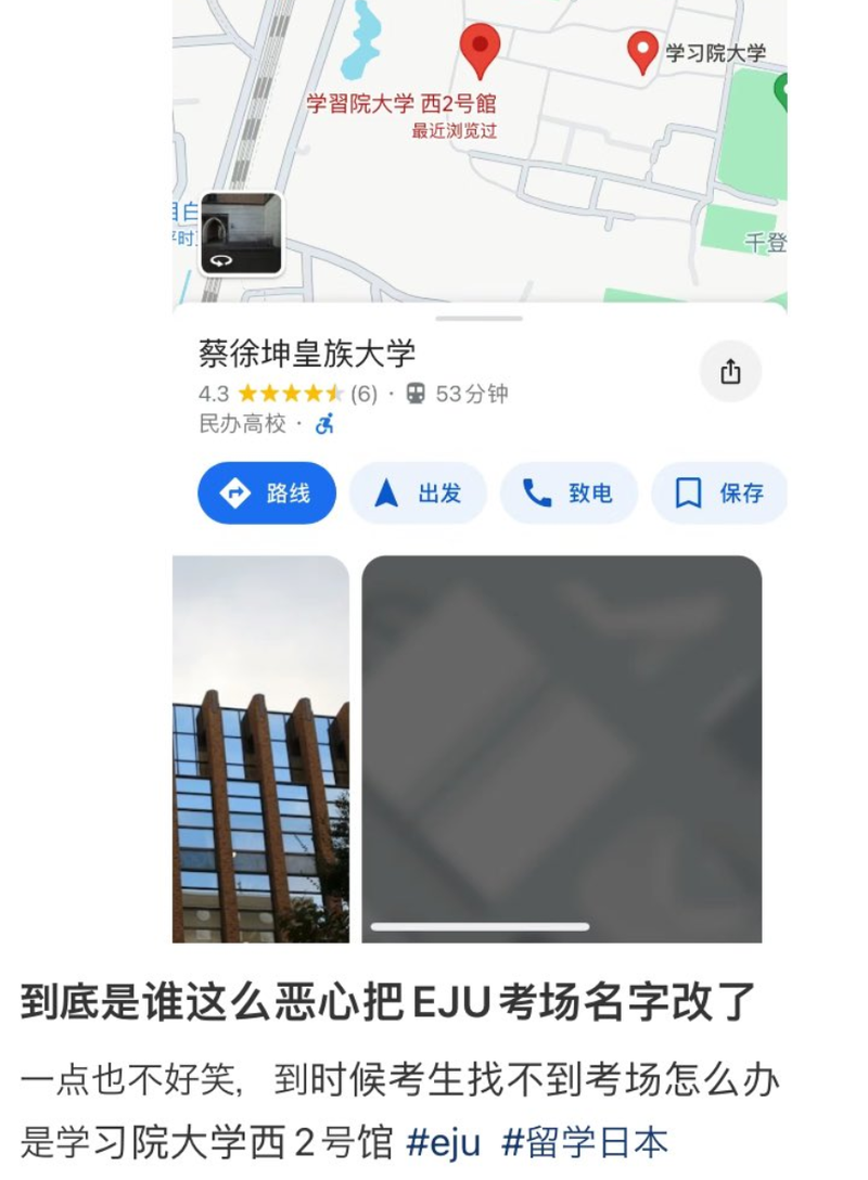 之前就有在日本(专题)的华人朋友,因为“学习院大学 西2号馆”被改成了“蔡徐坤皇族大学”,在网上吐槽,因为担心“有考生因此找不到考场”。