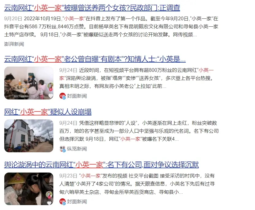 為了利益,他們可以擺拍、造假人設。就像“小英壹家”,網友此前拾分同情她,總結她的視頻內容是“家暴的丈夫、愛哭的孩子、幹不完的農活和破碎的她”,然而今年被扒出來的情況是賣慘引流,早已實現階級躍升。