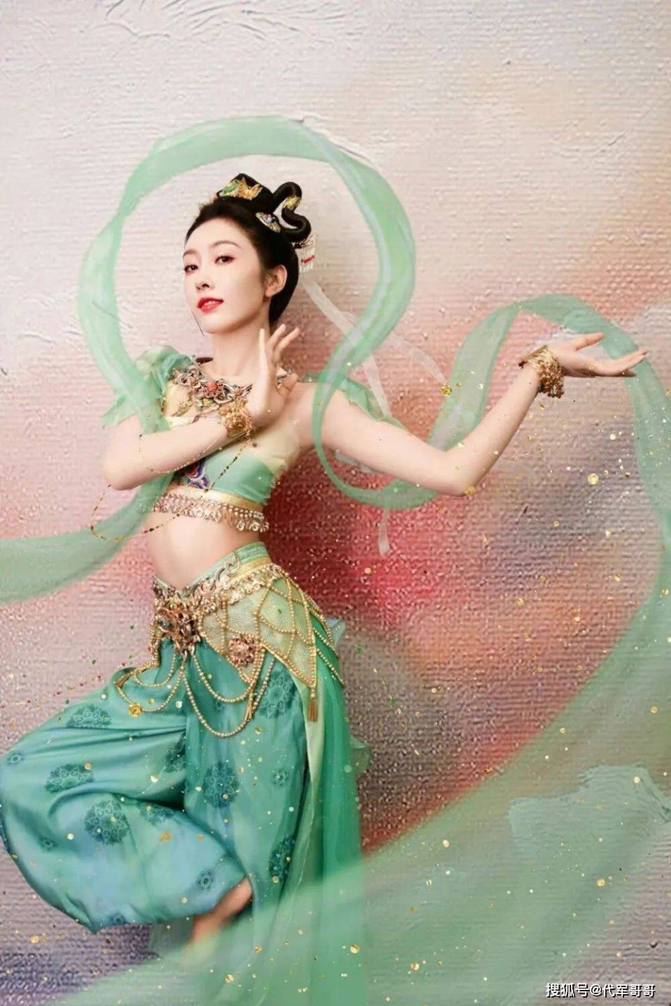 杨幂以其灵动的气质着称,她的敦煌飞天造型同样让人眼前一亮。轻盈的纱裙随风飘扬,仿佛每一片布料都蕴含着生命力。杨幂的动作流畅而有力,每一个转身、每一次跳跃,都像是飞天在云海中自由翱翔,将古典美与现代舞蹈完美融合。