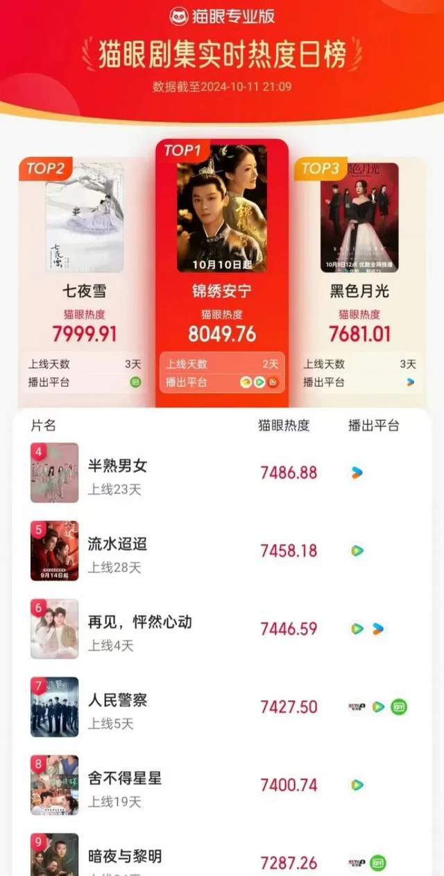 从首播数据看明显《锦绣安宁》的数据要好些,尤其是一经播出后登顶灯塔实时正片播放量的top1,《七夜雪》紧随其后,《锦绣安宁》的招广情况则是开局两广,腾讯站内播放热度破22800+,热播榜top1。