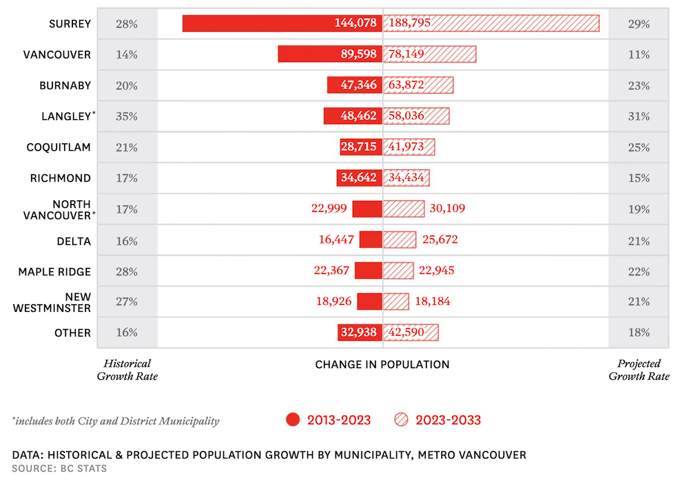 过去十年,即 2013 年至 2023 年期间,素里市人口增长领先大温哥华地区,净增 144,078 人,增长率为 28%。其次是温哥华,人口为 89,598 人(+14%),本拿比为 47,346 人(+20%),兰里市和兰里镇为 48,462 人(+35%),高贵林为 28,715 人(+21%),列治文为 34,642 人(+17%),北温哥华市和北温哥华区为 22,999 人(+17%)。