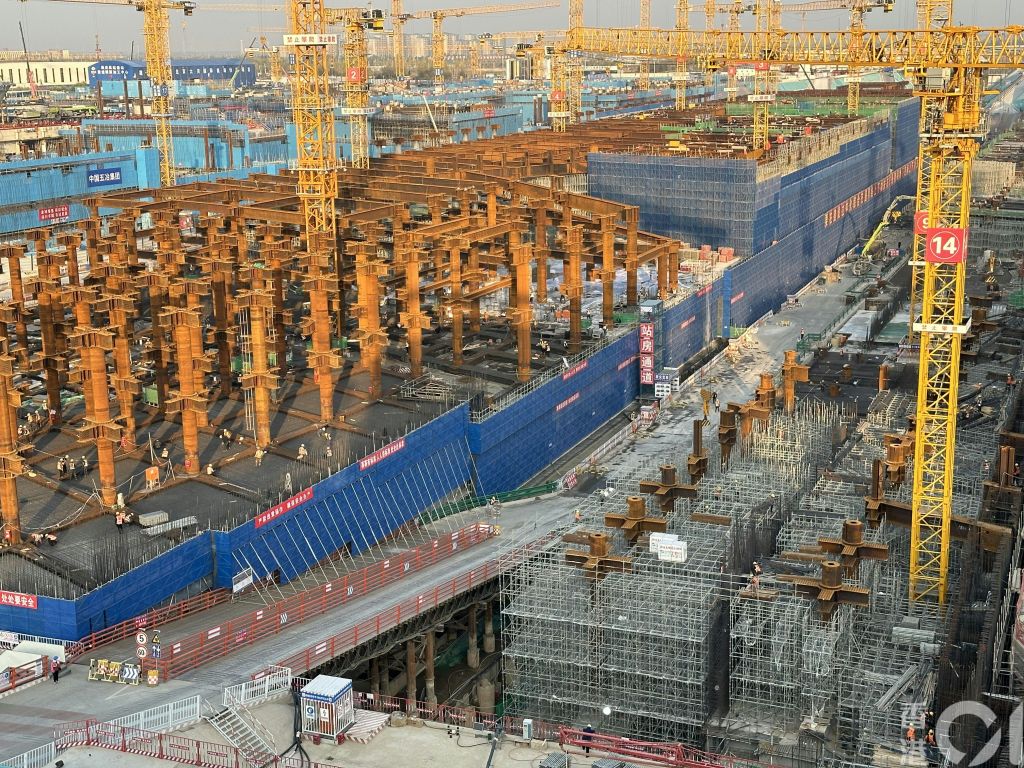 一望无际的施工现场有大量的塔式起重机(天秤),场面非常震撼。(朱加樟摄)