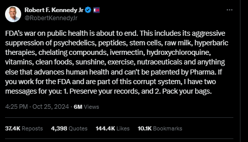 该帖子中,RFK宣称FDA对公共健康的压迫即将结束(指川普当选后,他将做的事),包括对致幻剂、多肽、干细胞、生牛奶、高压治疗、螯合物、伊维菌素、氯喹等这一系列有益健康的东西的打压。