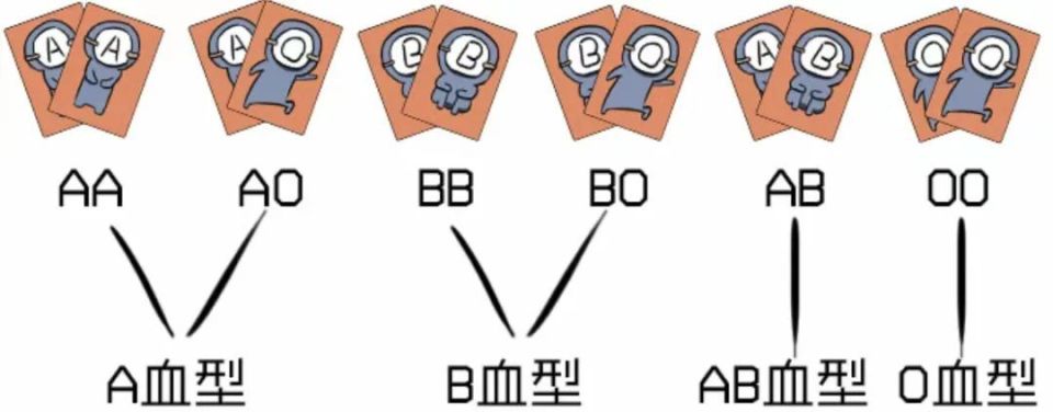 在壹對常染色體的相對位點上,A、B、O這3個等位基因均可輪換占位,因此,可組合成6種基因型:AA、AO、BB、BO、AB、OO。根據遺傳學原理,AO基因組合只呈現出A基因的表型,那麼血型就是A型。所以6種基因組合形式,只能表現為以下4種血型。