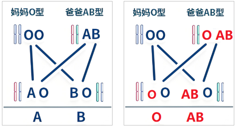 在上述案例中,女兒與父母血型不匹配的真相是:女孩父親的AB型基因發生了突變,A基因和B基因同時出現在同壹條染色體上,並全部遺傳給了女兒,再與母親遺傳的另壹條染色體結合,組成完整的雙倍體,使得女兒的血型呈現為AB型。