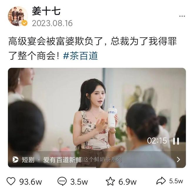 早前,茶百道有霸總題材的《愛有百道新鮮》,其形式是與短劇博主“打包定制”,性質屬於最豪氣的“廣告投放”。人設、劇情全部圍繞品牌展開,從而為品牌獲取線下門店難以比擬的曝光率。