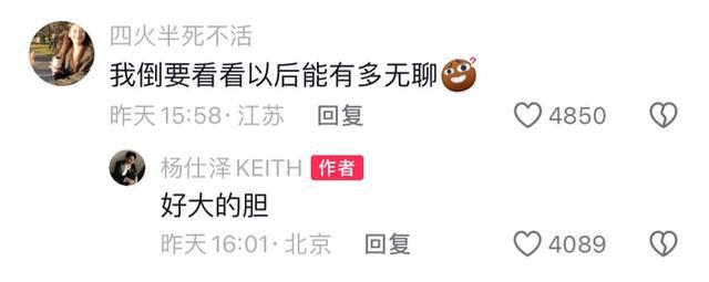 而且凭《永夜星河》火了之后,搜寻杨仕泽的网友也开始变多了。但“鸡柳大哥”可没有“坐以待毙”,反而还特意改了简介, 一句「谢谢你们跋山涉水找到这里,今后有你们无聊的」同样让网友笑得不行。有网友更留言道自己倒要看看有多无聊,没想到竟引来本尊回复“好大的胆”,和网友“隔空对战”的画面也相当逗趣。