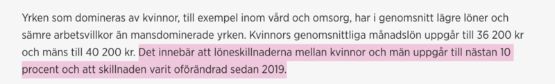 她还认为,人们缺乏对瑞典在实施促进性别平等的政策之前生活的了解,今天的年轻女性并不知道女性如何争取权利的历史,比如工作的权利、获得薪水的权利和经济独立的权利等等。