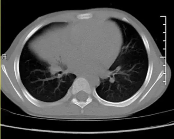1个月前,他没有明显诱因的开始发热,最高烧到38.9℃,时不时干咳几声。父母带他到当地医院就诊。综合检查显示,白细胞、CRP高,胸部CT提示右肺中叶实变伴肺不张。