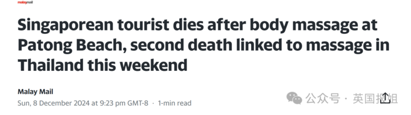 類似事件並不罕見,就在這幾天泰國警方稱,壹名新加坡游客在泰國芭東海灘接受身體按摩不久後死亡。