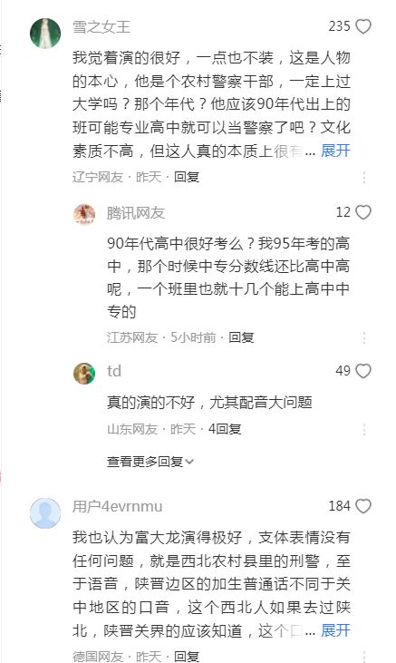 或許正是因為他對角色的深入挖掘和真實呈現,導致了壹些觀眾對角色的不滿。他們認為,富大龍飾演的角色過於真實,甚至有些“黑暗”,與他們心中的正義形象產生了沖突。
