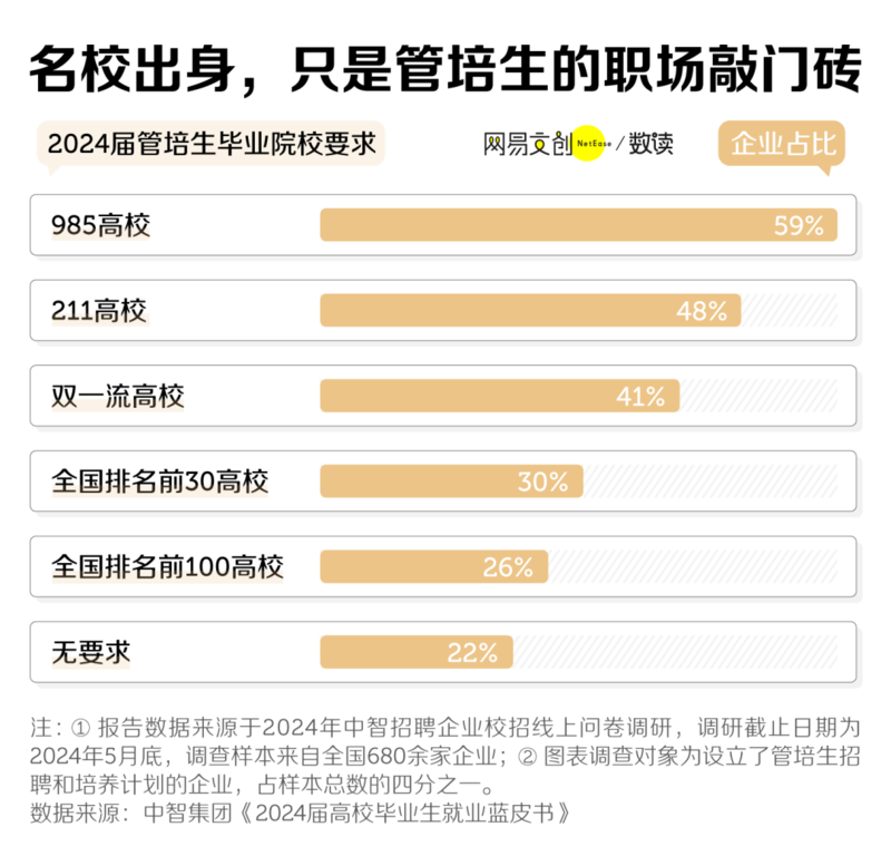 中智集团的《2024 届高校毕业生就业蓝皮书》显示,在设立管培生招聘计划的企业中,超过半数要求管培生毕业于 985 高校,对管培生毕业院校不作要求的企业最少,占比 22%。