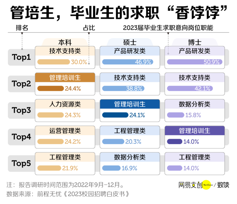 据前程无忧的《2023 校园招聘白皮书》,无论学历在本科还是博士,管培生都是 2023 届毕业生求职的热门选择,尤其是本科生,希望成为管培生的人数占比为 24.4%,仅次于技术支持类岗位。