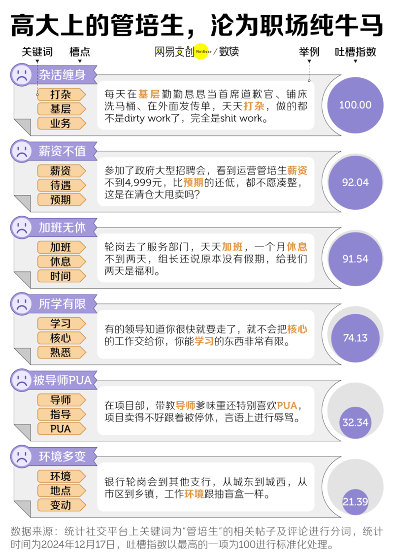 我们统计了社交平台上关于管培生的讨论后发现,真实的管培生日常,是打杂、加班、被捧杀,吃得苦中苦,方为管培生。