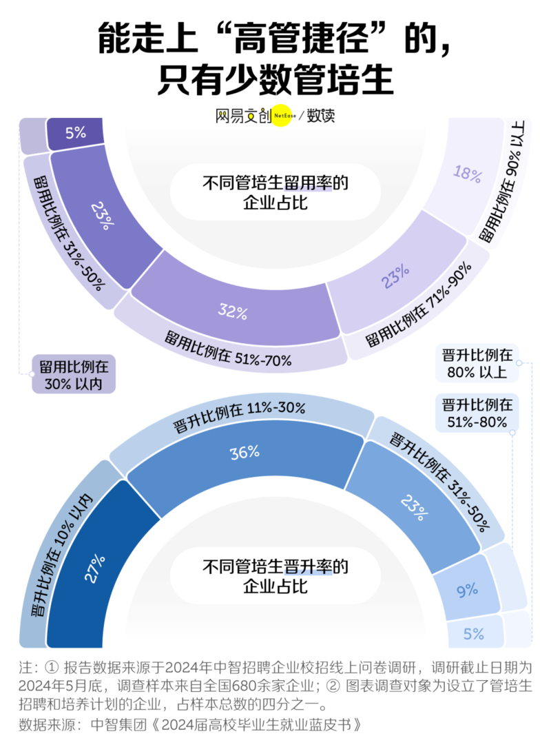 据中智的《2024 届高校毕业生就业蓝皮书》,2024 届毕业生试用期转正留存率在 90% 以上的企业占比 75%,而管培生留用比例在 90% 以上的企业占比不到两成 [7],换句话说,相比试用期转正的毕业生,管培生最终留在企业的概率明显更低。