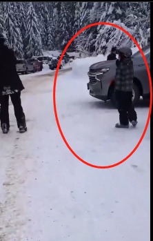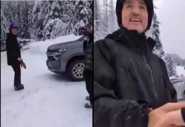 一位女子在红山度假村一个积雪覆盖的停车场看到特鲁多靠近一辆SUV时,她用手机摄像头说道:“先生,总理先生、”