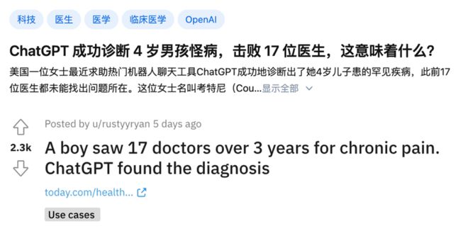 此前在美国,就有过「ChatGPT 诊断 4 岁男孩罕见病,击败 17 位专家」的事件报道: