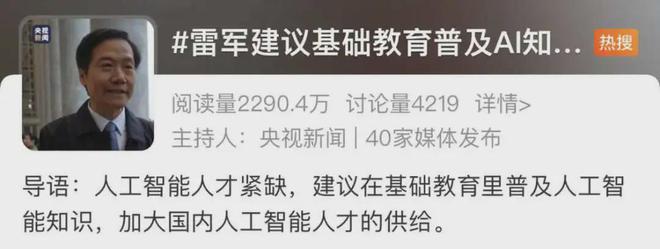 就连小米 CEO 雷军也在今年两会上正式建议:要将 AI 纳入九年义务教育,加强培养 AI 人才。