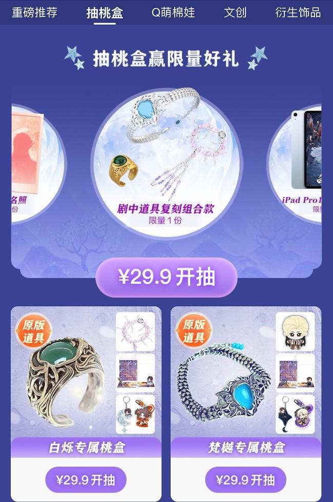 爱奇艺用户参与“抽桃盒”玩法,将有机会赢取更多限量好礼,包括剧中原版道具异王剑灵戒指、无念石手链,明星签名照等。