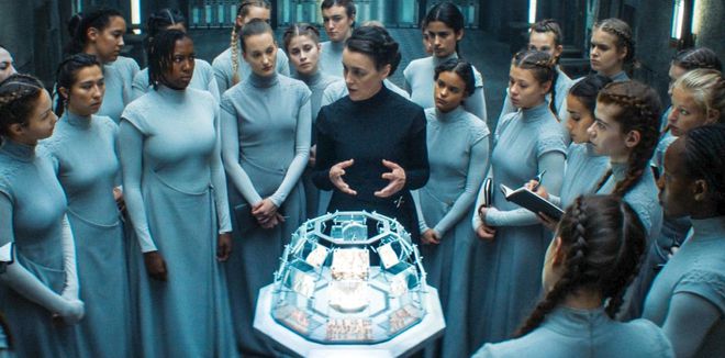 剧集在视觉层面试图延续电影版的美学风格,线条简约的建筑,粗粝朴素的材质,灰度很高的色调。作为一个发生年代久远的故事,《沙丘:预言》中还没有发展出电影版般精妙的装饰和物件,但剧集在保持科幻类型的未来感的同时,为其赋予了一种中世纪般的历史质感。