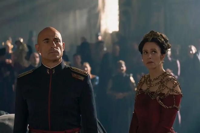在造型上与之形成对比的是彼时的皇室科瑞诺家族,皇帝哈维科·科瑞诺由“马强”马克·斯特朗饰演。他们那融合金属质感和古希腊风格的长裙,强化了本剧所追求的古典权谋特质。