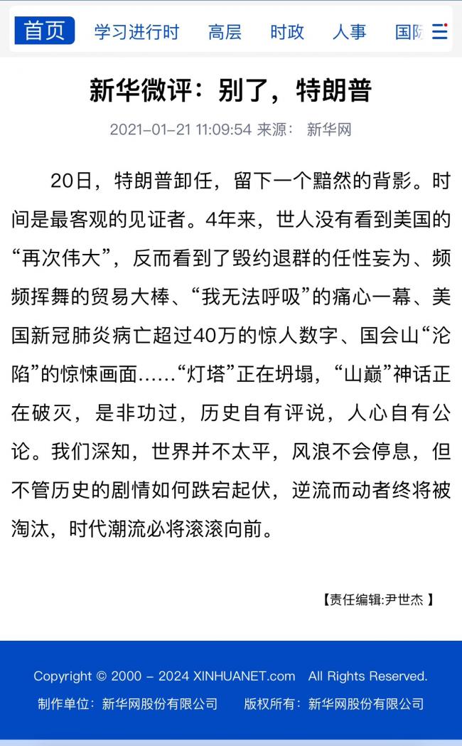 大约北京对这段经历记忆犹新,人民日报历数“中美两国老一辈领导人实现‘跨越太平洋的握手’”到中美建交等“重大历史事件”后,演绎习近平与川普通话时的语调,强调“中美关系已经变成你中有我、我中有你的利益共同体”,并称“中美关系中存在的一些问题,是双方利益深度融合带来的成长的烦恼……而不应该导致双方产生错误的战略认知。”最后提醒即将上任的美国总统“遏制打压阻挡不了中国的发展,还会损害美国利益”。