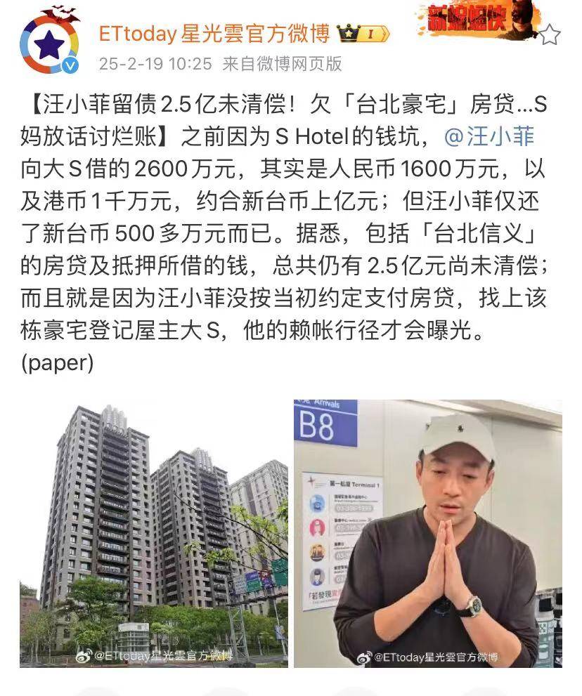 台媒報道汪小菲拖欠大S債務高達2.5億新台幣,之前經營台北酒店,向大S借款2600萬元,其實是人民幣1600萬元,及港幣1000萬元,約合新台幣上億元,但汪小菲只是償還了500新台幣,折合人民幣也只有111多萬。