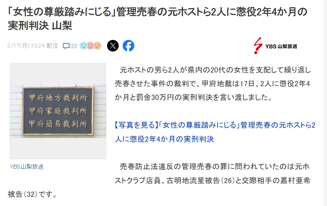 根据调查,两人曾强迫受害者在一个月内卖春达107次,还给她设定了每天10万日元的“业绩目标”,如果没有完成,就会对其实施暴力。