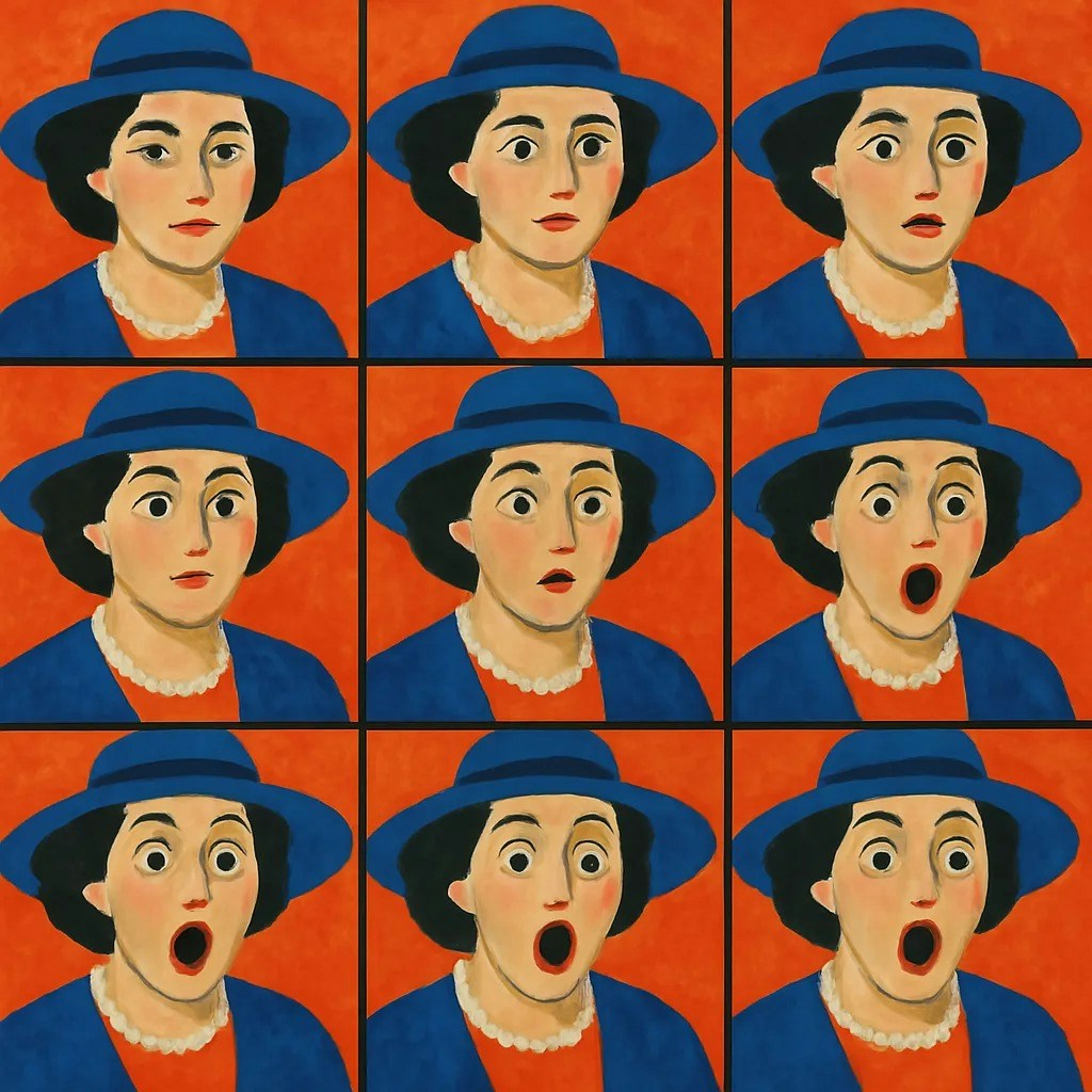 提示语:创建一个马蒂斯风格的艺术动画,最终图像被分成多个子图像,每个子图都是连续动画关键帧,请描绘一位贵妇被吓得大吃一惊的过程:一位贵妇面对着镜头,然后脸上露出不安的表情,接着眼睛瞪大,嘴巴张开,捕捉最后目瞪口呆瞬间。请确保关键帧过渡流畅且连续,并包含尽可能多的帧,以实现动画的高流畅度和细节。 人物应在每一帧中保持居中,所有帧大小相等,并完美排列在一个 nxn 的网格中,形成单张图像 。