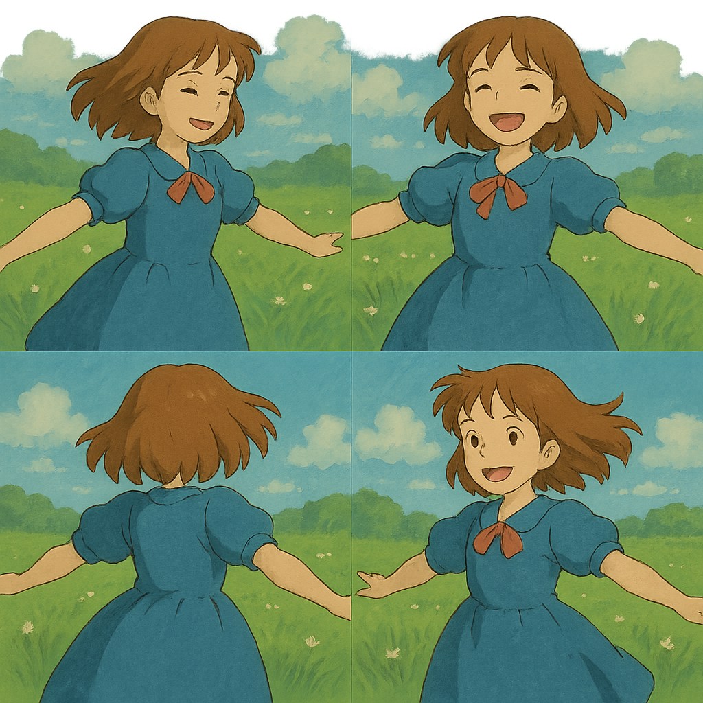 创建一个吉卜力风格艺术动画,最终图像被分成多个子图像,每个子图都是连续动画关的键帧,请描绘一个女孩儿转头对着镜头wink的过程:女孩儿背对镜头,披肩长发;然后转过头,对着镜头,微笑,最后捕捉对着镜头wink瞬间。请确保关键帧过渡流畅且连续,并包含尽可能多的帧,以实现动画的高流畅度和细节。 人物应在每一帧中保持居中,所有帧大小相等,并完美排列在一个nxn的网格中,形成单张图像 。