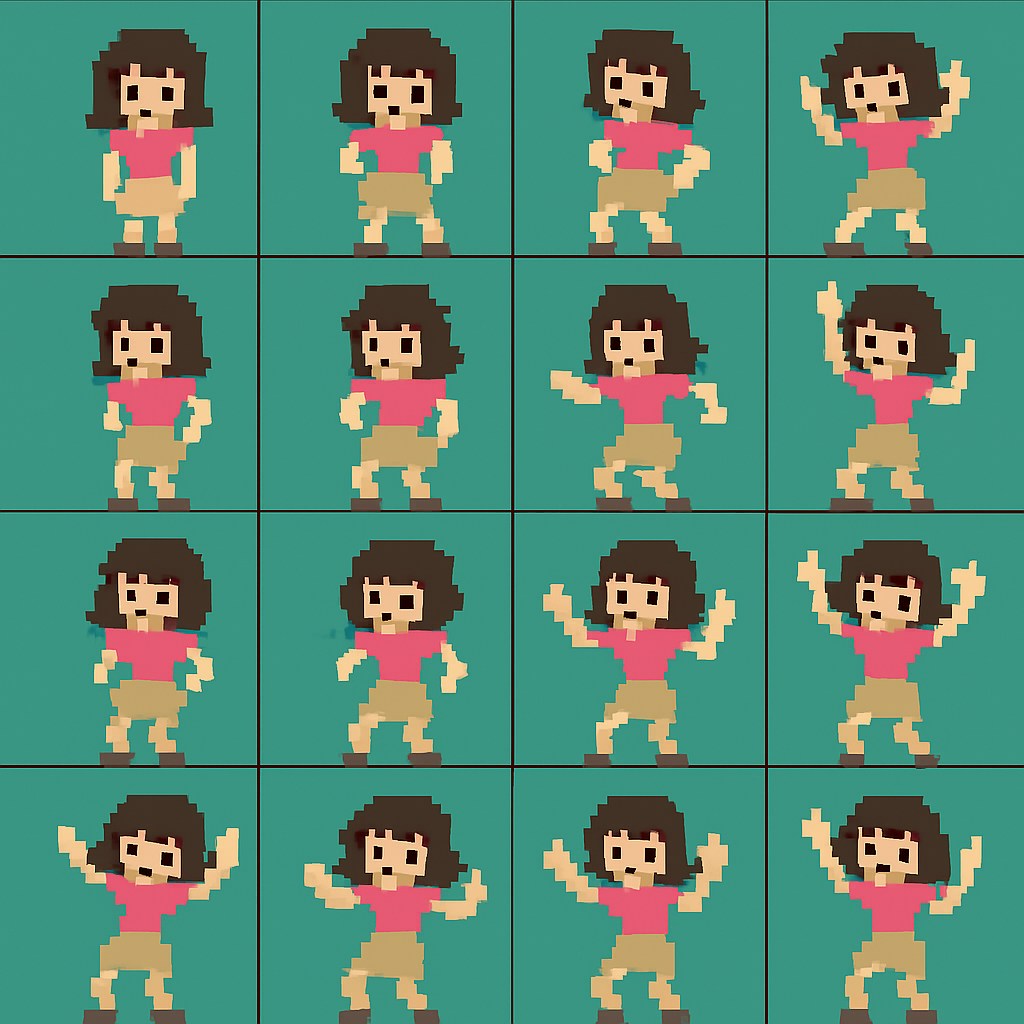 创建一个像素风格的艺术动画,最终图像被分成多个子图像,每个子图都是连续动画关的键帧,描绘一个女孩儿尬舞的过程:面对镜头,开始扭动臀部, 左右扭动,手舞足蹈。请确保关键帧过渡流畅且连续,并包含尽可能多的帧,以实现动画的高流畅度和细节。 人物应在每一帧中保持居中,所有帧大小相等,并完美排列在一个nxn的网格中,形成单张图像。