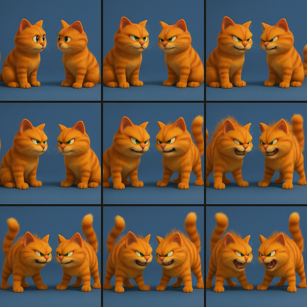 创建一个皮克斯风格艺术动画,最终图像被分成多个子图像,每个子图都是连续动画关键帧,请描绘两只加菲猫敌视对方,要打架的过程:两只猫对视,接着露出凶狠表情,身上的毛竖起来、尾巴竖起来,最后捕捉要打架的瞬间。请确保关键帧过渡流畅且连续,并包含尽可能多的帧,以实现动画的高流畅度和细节。 动物应在每一帧中保持居中,所有帧大小相等,并完美排列在一个n- 新闻来源于其它媒体,内容不代表本站立场!