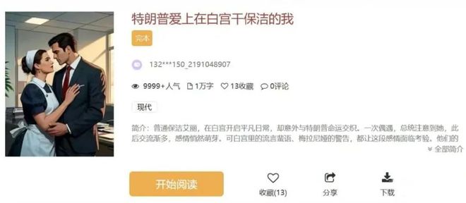 最上头的还得是剑走偏锋类的爱情主题:《跟总统离婚,我分走了半个美国》《特朗普爱上在白宫干保洁的我》《我和特朗普生了99个孩子》。