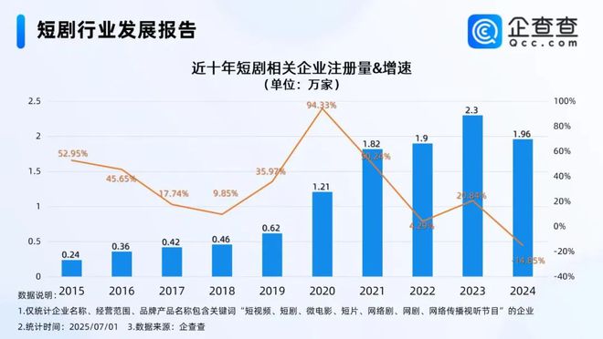 据企查查数据,我国现存的短剧相关企业多达9.61万家。2020年是突飞猛进的一个转折点,注册了1.21万家,同比增长94.33%。