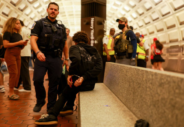 在华盛顿特区执法力量增强之际,警员和一名联邦探员上周五拘留了一名男子。图片来源:Jose Luis Gonzalez/Reuters