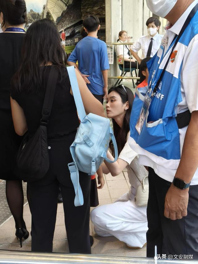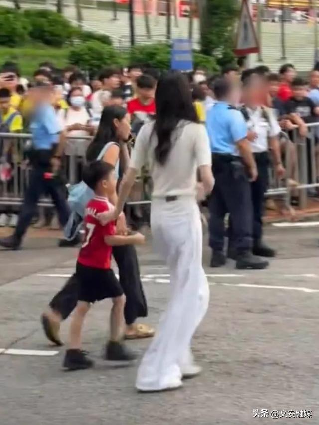 8 月 19 日的夜晚,体育场馆内流光溢彩,数万球迷的欢呼声浪几乎要掀翻屋顶。在这片沸腾的红色海洋里,奚梦瑶牵着儿子何广燊的小手穿过人群,白色上衣在璀璨灯光下像一汪静谧的月色,与周围狂热的氛围形成奇妙的和谐。