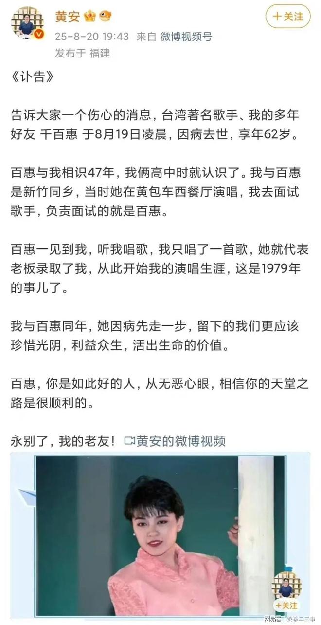 原计划中,这周末她本该站在山西阳泉的舞台上,如今演出海报犹在,歌声已成绝响。据工作人员透露,8月23日将在北京举行告别式。前经纪公司袁先生低声请求:“惠姐非常善良,希望大家善言善语,愿她一路走好!”