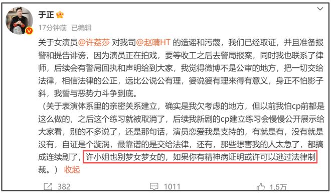 后续许荔莎说要整理时间线,于正则再度发文回应,这次是为赵晴发声,直接点名许荔莎对赵晴造谣污蔑。哎?给许凯发声明的时候怎么不点名,只说网传造谣艺人啊?