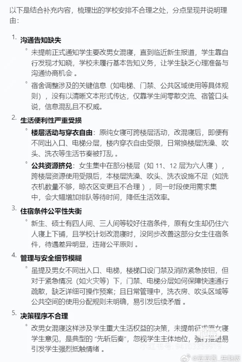 学生纷纷发帖抱怨,女生生活受到严重影响,洗衣服、淋浴等公共资源严重受损,并且,由于消防通报被关闭,存在严重的公共安全隐患,另外,学校一直没有正式通知该楼女生,决策过程完全“黑箱操作”,完全不尊重学生的权益。